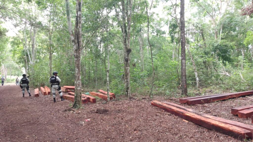 GN localizó 29 troncos de madera ilegal en comunidad ejidal Conhuas, Calakmul, Campeche